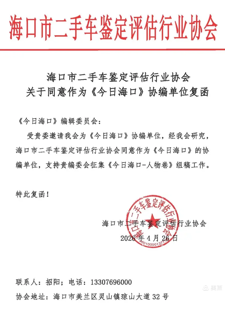 据悉,《今日海口》编辑委员会此前向海口市二手车鉴定评估行业协会发出邀请,希望其能担任协编单位。经协会内部研究讨论,于2026年4月26日正式回函同意。协会相关负责人表示,将充分发挥自身在行业内的资源优势,积极推荐行业内优秀人物事迹,为《今日海口-人物卷》提供丰富且有价值的素材。